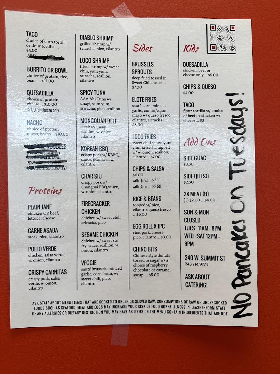 The menu at Chino Loco offers a thoughtful blend of Mexican and Asian-inspired fusion dishes, crafted for those looking to enjoy casual, flavorful meals that are perfect for takeout. With a focus on simple yet satisfying bites, the selection invites diners to explore unique combinations like Spicy Tuna Tacos and Korean BBQ Pork alongside classic options such as Beef Burritos and Cheese Quesadillas.